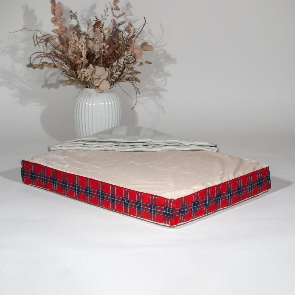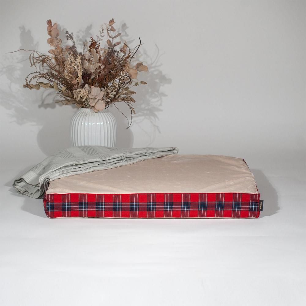 カバー側面には、柔らかな風合いの上質な30sの先染め*起毛コットン(赤タータンチェック)を使用しています。